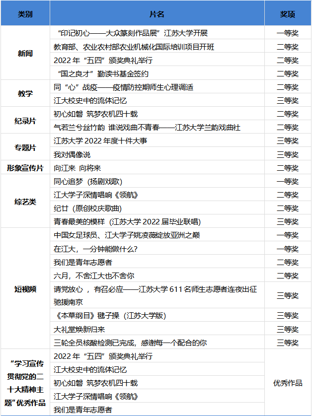 近年來,黨委宣傳部堅持圍繞中心、服務大局,注重創新理念、主動作為,積極推動融媒體建設,努力講好江大故事,傳播江大好聲音,不斷提升視頻傳播的權威性和影響力。此次獲獎作品分屬新聞類、教學類、綜藝類、紀錄片、專題片、形象宣傳片、短視頻 7個類別,涵蓋了理想信念、文化傳承、校友情懷、疫情防控等主題,反映了學校鮮明的學科特色與文化情懷。(黨委宣傳部)