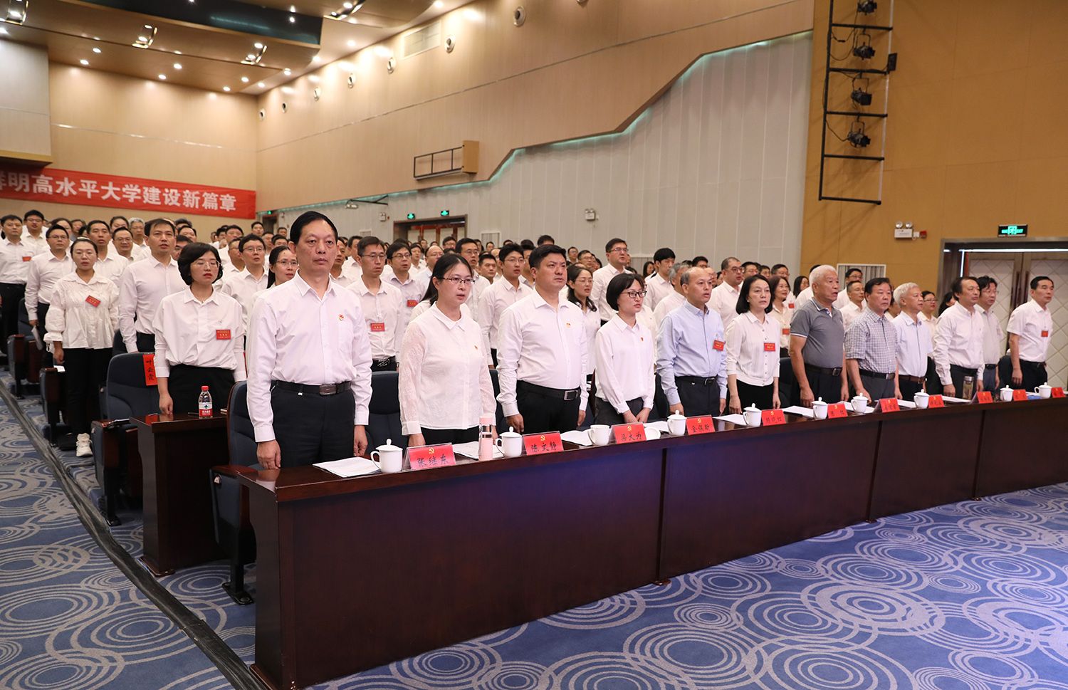 開幕會現場氣氛莊嚴熱烈,主席臺正中懸掛的中國共產黨黨徽熠熠生輝,10面鮮艷的紅旗分列兩側。會場后方,“牢記囑托,堅定信心,爭創一流,奮力譜寫特色鮮明高水平大學建設新篇章”的橫幅莊重醒目。