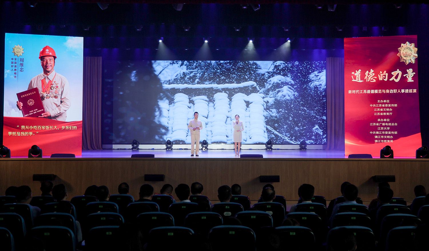 10月25日,由中共江蘇省委宣傳部、江蘇省文明辦、江蘇省教育廳主辦,江蘇省廣播電視總臺、江蘇大學(xué)、中共鎮(zhèn)江市委宣傳部、鎮(zhèn)江市文明辦、鎮(zhèn)江市教育局承辦的“道德的力量”——新時代江蘇道德模范與身邊好人事跡高校巡演走進(jìn)我校。