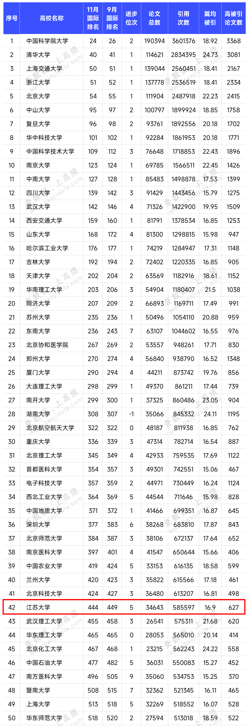 數據顯示,江蘇大學國際排名444位,較9月提升5位;位列中國內地高校42位。