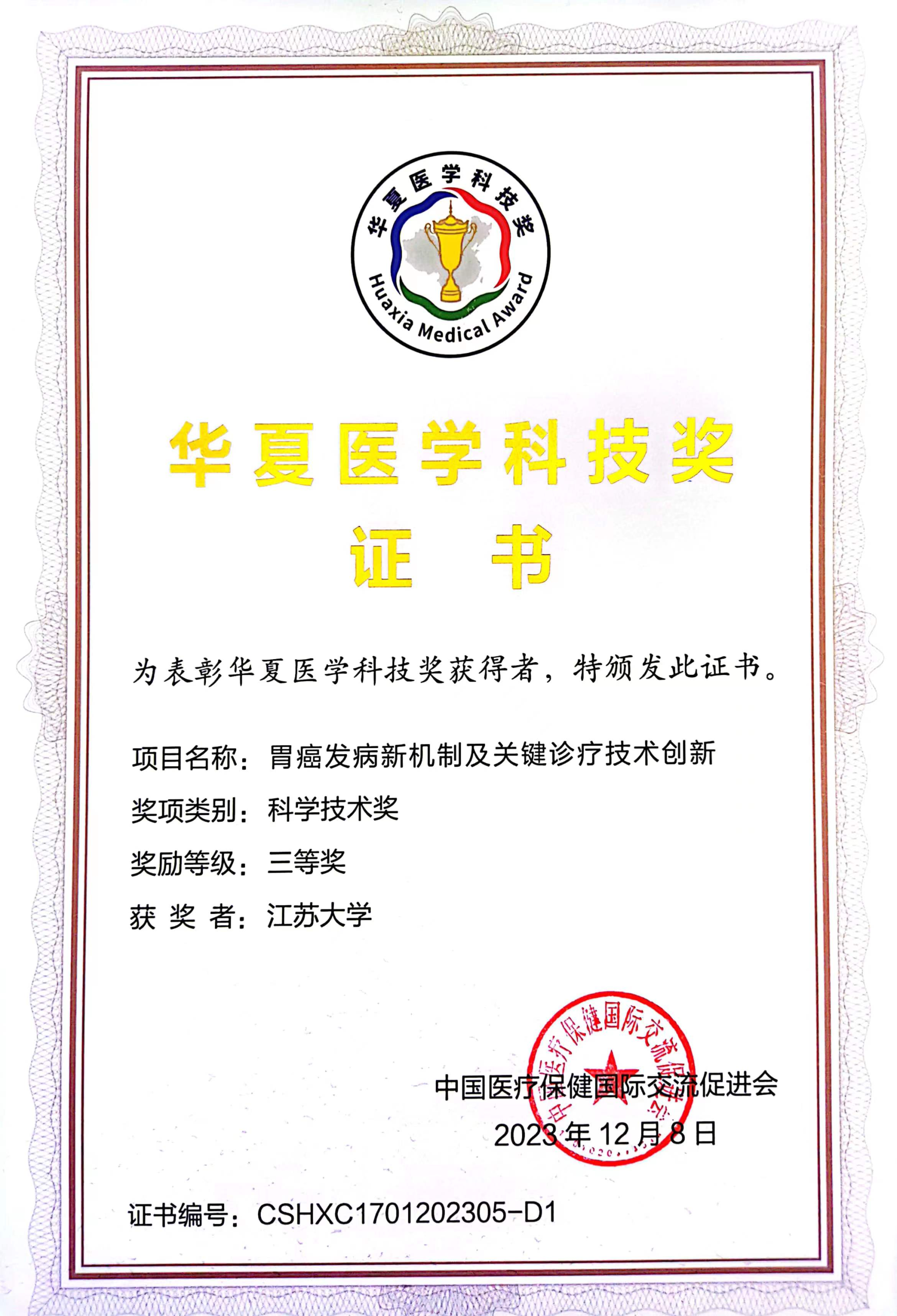 12月9日,2023年度華夏醫學科技獎獲獎名單正式公布。以江蘇大學為第一完成單位、張徐教授為第一完成人的《胃癌發病新機制及關鍵診療技術創新》項目榮獲華夏醫學科技獎三等獎。