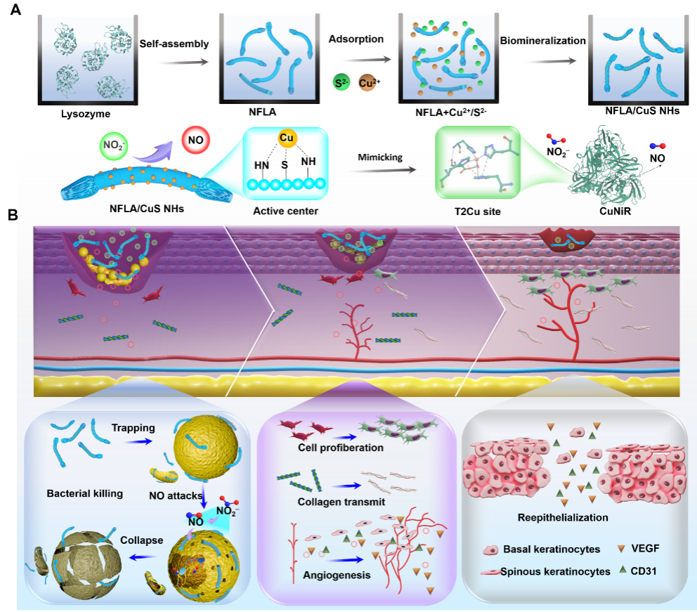 在本研究中,團隊通過生物礦化構(gòu)建了一種CuNIR模擬物(溶菌酶自組裝納米纖維/CuS納米雜化物,NFLA/CuS NHs),該模擬物能夠催化亞硝酸鹽生成NO,其中超小CuS納米顆粒作為活性中心,而NFLA作為具有輔因子作用的骨架。研究揭示了CuNIR模擬物增強的催化活性與其特定結(jié)構(gòu)之間的密切關(guān)系,NFLA表面暴露的超小CuS簇和Cu原子結(jié)構(gòu)以及NFLA在模仿CuNIR固有活性中的特定輔因子效應(yīng)(如對抗壞血酸的良好親和性)在速率決定步驟中的重要性。研究表明,以上兩個因素協(xié)同作用,共同增強了催化活性。