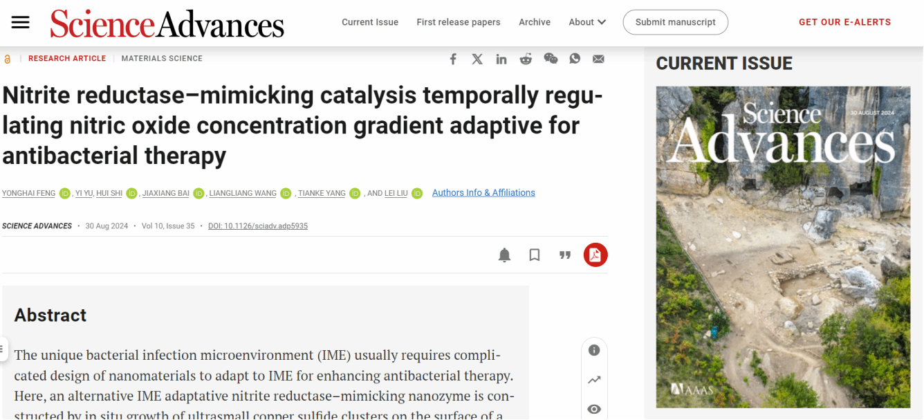 近日,我校材料科學與工程學院新材料研究院劉磊、馮永海團隊在Science子刊《科學進展》(Science Advances)上在線發(fā)表研究論文“Nitrite reductase–mimicking catalysis temporally regulating nitric oxide concentration gradient adaptive for antibacterial therapy”。江蘇大學為第一完成單位,馮永海副研究員為第一作者,劉磊研究員為最后通訊作者,南京醫(yī)科大學附屬常州二院王亮亮博士、中國科學技術(shù)大學附屬第一醫(yī)院楊甜柯博士為共同通訊作者。