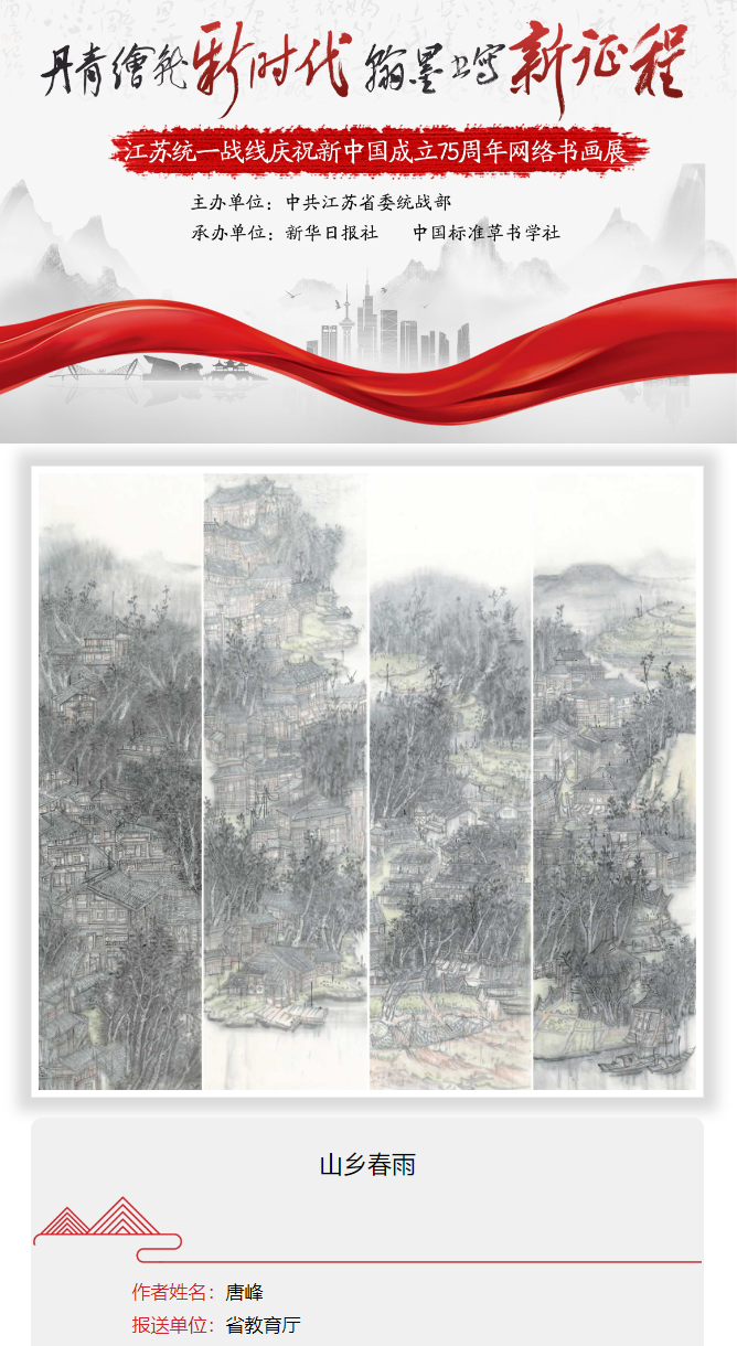 近日,省委統戰部公布了“丹青繪就新時代,翰墨書寫新征程”慶祝新中國成立75周年網絡書畫展作品征集評選名單,我校藝術學院副教授唐峰的作品《山鄉春雨》入展。