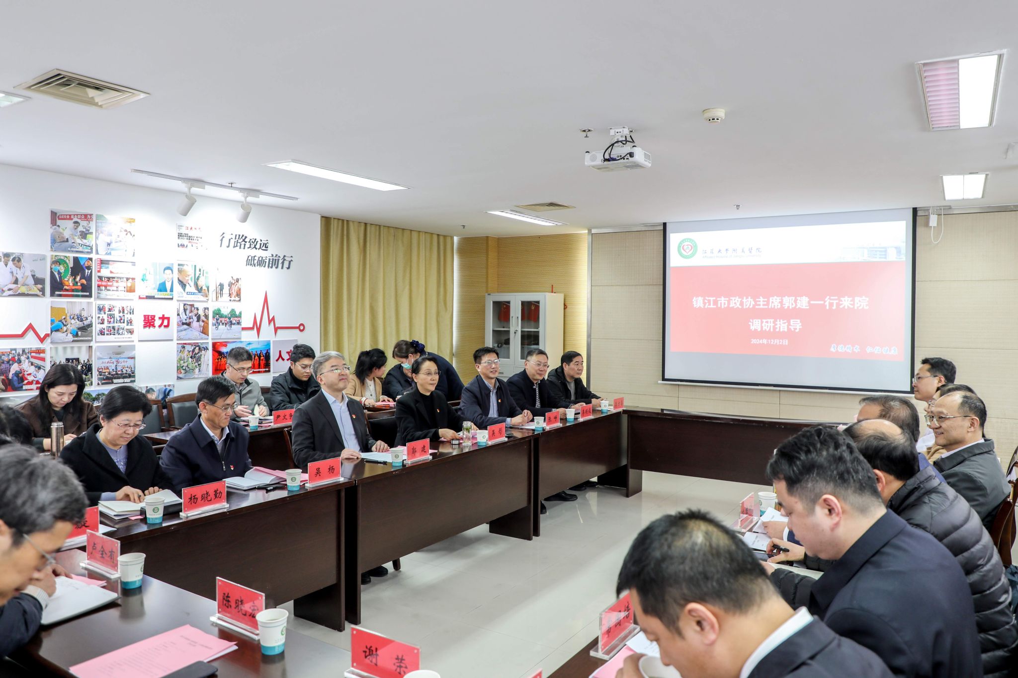 12月2日,鎮江市政協主席郭建率調研組到附屬醫院調研指導,江蘇大學黨委副書記、附屬醫院黨委書記張濟建陪同調研。附屬醫院院長陳吉祥主持座談會。