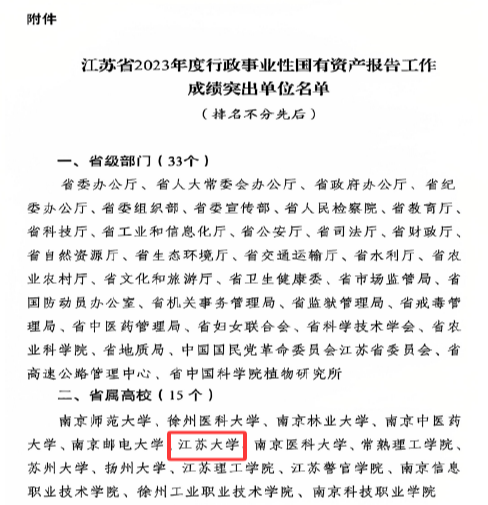 近日,江蘇省財政廳發文反饋江蘇省2023年度行政事業性國有資產報告工作情況,并對成績突出單位進行通報表揚。全省共有15所省屬高校受到表揚,我校名列其中,這也是學校連續兩年獲得該項榮譽。