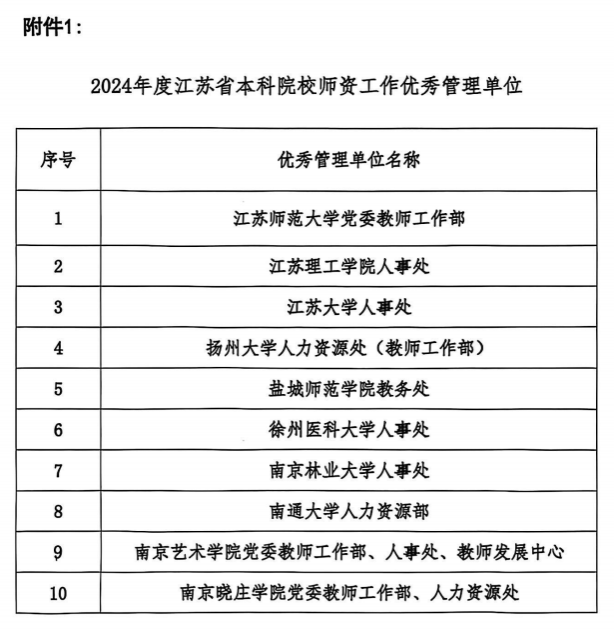 近日,江蘇省高校師資培訓中心發布《關于表彰2024年度全省本科院校師資工作優秀管理單位、優秀管理工作者的決定》,我校人事處獲“2024年度江蘇省本科院校師資工作優秀管理單位”稱號,人事處教職工湯春梅被評為“2024年度江蘇省本科院校師資工作優秀管理工作者”。