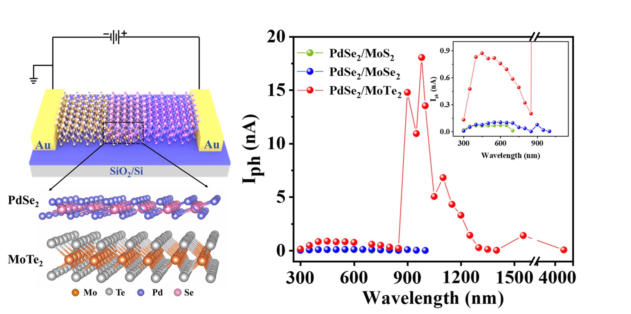 課題組在《先進功能材料》發表題為High-Performance Infrared Self-Powered Photodetector Based on 2D van der Waals Heterostructures的論文,提出了一種基于PdSe2/MoTe2范德華異質結的高性能自供電紅外光電探測器。該器件在零偏壓下實現300-4050nm的超寬光譜響應,在980nm處性能指標可與2D/3D異質結器件相媲美,并揭示了構建2D/2D高性能紅外自驅動光電探測器三個必要條件:兩種材料功函數差大、高紅外吸收和II型波段對齊。該探測器不同于現有的在紅外波段2D/3D光電探測器,為微型化、低功耗2D/2D紅外光電探測器的設計提供了新思路,在紅外成像技術、柔性電子與物聯網設備的設計等領域具有巨大應用潛力。