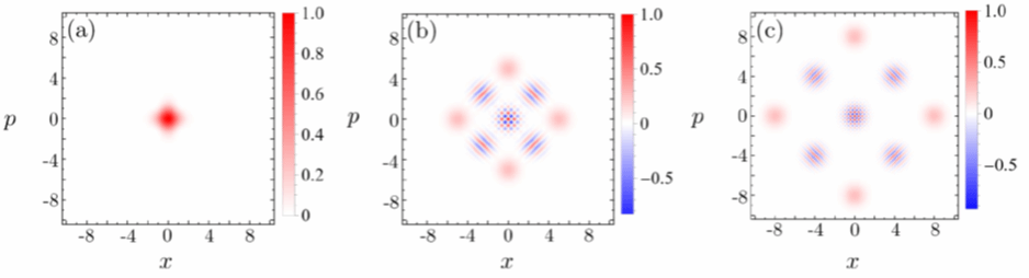 課題組還在Physical Review A上發表了系列文章。題為Enhancement in the temperature sensing of a reservoir by a Kerr-nonlinear resonator的論文,通訊作者為謝月娥,提出了一種采用克爾非線性諧振器來精確測量量子儲層溫度的技術方案。通過保真度進行評估該方案中的熱化,并利用量子Fisher信息來評估量子溫度計方案的計量潛力。通過增加克爾非線性系數和驅動幅度可以顯著提高溫度的精度。此外,通過分析穩態下的探針純度和評估零差與外差檢測方法的性能來探索潛在的物理機制。研究表明最佳零差檢測總是優于外差檢測。題為Sub-shot-noise sensitivity via superpositions of two deformed kitten states的論文,通訊作者為楊孝森,探索了光子增加和減少操作對疊加小貓態在相空間中非經典效應的影響。通過兩種操作順序(先增后減與先減后增),多光子操作能產生近乎各向同性的亞普朗克結構,其特性受操作順序影響:增加光子壓縮結構,減少光子則擴展或無效。最優多光子操作可提升結構各向同性,并顯著增強態對位移的敏感性,超越標準量子極限。這一發現為量子計量學和精密測量提供了新工具,在量子傳感、成像及信息處理中具有應用前景。(物電學院)