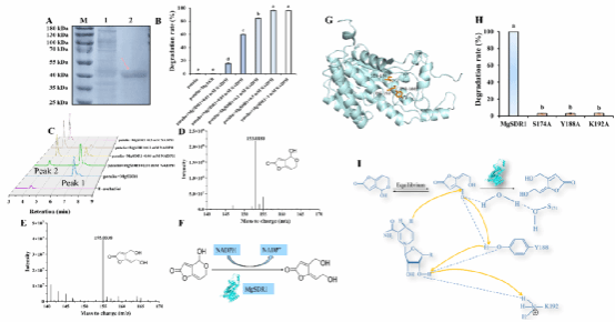 該研究聯(lián)合RNA-seq及分子對(duì)接技術(shù)分析了Meyerozyma guilliermondii降解PAT的分子機(jī)制,發(fā)現(xiàn)M. guilliermondii通過(guò)增強(qiáng)抗氧化脅迫、GSH代謝、DNA損傷修復(fù)、DNA復(fù)制、生長(zhǎng)和繁殖、抗性和耐藥、潛在降解酶的解毒以及鋅指轉(zhuǎn)錄因子的調(diào)控相關(guān)基因的表達(dá)來(lái)解除或降低PAT脅迫造成的有害影響。該研究還篩選到了一個(gè)新型PAT降解酶(短鏈脫氫酶/還原酶(short-chain dehydrogenase/reductase,MgSDR1))。MgSDR1可在2 h內(nèi)將10 μg/mL初始濃度的PAT轉(zhuǎn)化為無(wú)毒的E-ascladiol。進(jìn)一步研究發(fā)現(xiàn),生物降解過(guò)程對(duì)新鮮梨汁的品質(zhì)沒(méi)有負(fù)面影響。此外,結(jié)合分子對(duì)接及氨基酸定點(diǎn)突變技術(shù)分析了催化三聯(lián)體(Ser174、Tyr188和Lys192)對(duì)MgSDR1降解PAT能力的影響,將上述三個(gè)氨基酸殘基突變?yōu)楸彼岷螅蛔兊鞍讕缀醪荒芙到釶AT,表明MgSDR1的催化三聯(lián)體在PAT降解過(guò)程中發(fā)揮重要作用。