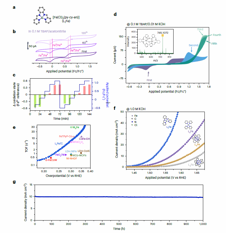 在雙碳背景下,可持續電催化CO2還原和水氧化是緩解環境問題的有效途徑。然而,陽極析氧反應(OER)過電位高,能耗大,對稀缺貴金屬依賴性強以及目前對電還原催化劑的性能和機理理解不足等問題限制了其應用。鑒于此,該研究報道了一種活性雙鐵電催化劑[Fe2(μ-O)(μ-OH(L1)2],其中L1是含氮配體。該催化劑在OER反應中表現出優異的性能,在1.580V下實現20.2s?1的轉換頻率,在10mA cm-2的電流密度下具有184mV的超低過電位,并且在1000h內具有出色穩定性。通過自旋交叉驅動的二聚機制,實現了從單鐵到雙鐵活性構型的轉變,增強了金屬-配體共價性,有助于高效雙活性位點OER催化反應的關鍵中間體O-O的形成,顯著提升了催化活性和穩定性,為高性能OER催化劑的設計提供了新的思路。該研究不僅推進了綠色制氫、動態活性位點演化和自旋態調控的作用,還為可持續電化學CO2還原和綠色析氫領域分子催化劑的設計提供了寶貴的機理見解。該工作凸顯了連接水氧化與CO2利用、邁向碳中和能源體系的統一設計原則。