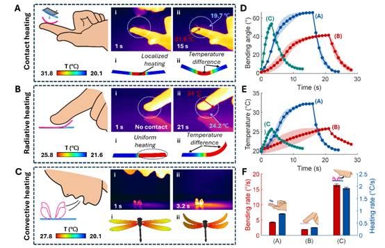 該研究創(chuàng)新性地提出了螺旋編程取向制備技術(shù),通過兩階段巰基-丙烯酸酯邁克爾加成與光聚合反應(yīng),研制了預(yù)編程應(yīng)變高達(dá)2500%的超拉伸液晶彈性體,超越了傳統(tǒng)液晶彈性體的應(yīng)變極限。特別值得關(guān)注的是,在此基礎(chǔ)上制備的超拉伸液晶彈性體LCE-25驅(qū)動(dòng)器展現(xiàn)出優(yōu)異的低溫驅(qū)動(dòng)特性,極大降低了液晶彈性體驅(qū)動(dòng)器所需的響應(yīng)溫度,可實(shí)現(xiàn)25-33℃驅(qū)動(dòng)溫度下16.75°/s的熱形變。