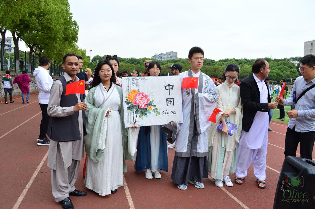 活動現場,中外學生情緒高漲、積極表現,都身穿本民族特色服裝,手持具有國家特色的標牌,圍繞校園一路載歌載舞。同時,每個國家的代表團都高舉本國國旗,表達對自己國家的熱愛和對世界多元文化的認同。