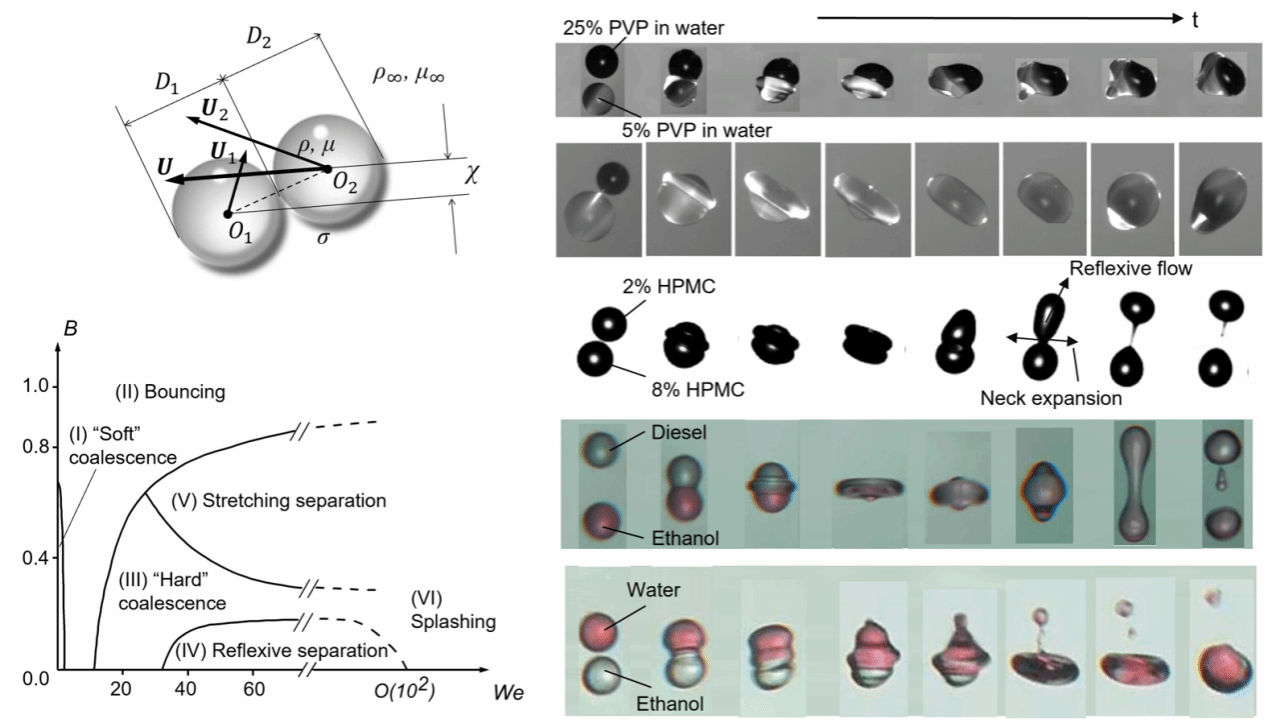 雙元液滴碰撞與自然界中多種物理現象和工業過程緊密相關,涉及從原子物理到大氣環境,從發動機噴霧燃燒到生物制藥工程、增材制造等多學科領域。作為跨越廣泛物理尺度的復雜流體動力學平臺的基石,其非線性動力學、界面力學、分子作用力學等復雜物理機制對于控制液滴聚合以優化反應過程、實現對液滴碰撞行為的精確調控等至關重要。該研究從兩個相同大小液滴的碰撞入手,揭示液滴合并、彈跳和分離現象轉捩的內在物理機制。液滴宏觀運動、內部流動以及涉及稀薄氣體流動和范德華分子力的微觀界面氣膜動力學之間的相互作用,揭示了本質的碰撞動力學多尺度和多物理特性。文章討論了大小不等的液滴、非牛頓流體、不同種流體以及類比的射流—射流碰撞情況等,重點強調對二元液滴碰撞現象的本質理解及其對實際過程的指導。液滴碰撞多尺度多物理機制,為跨尺度流體動力學研究提供理論框架。
