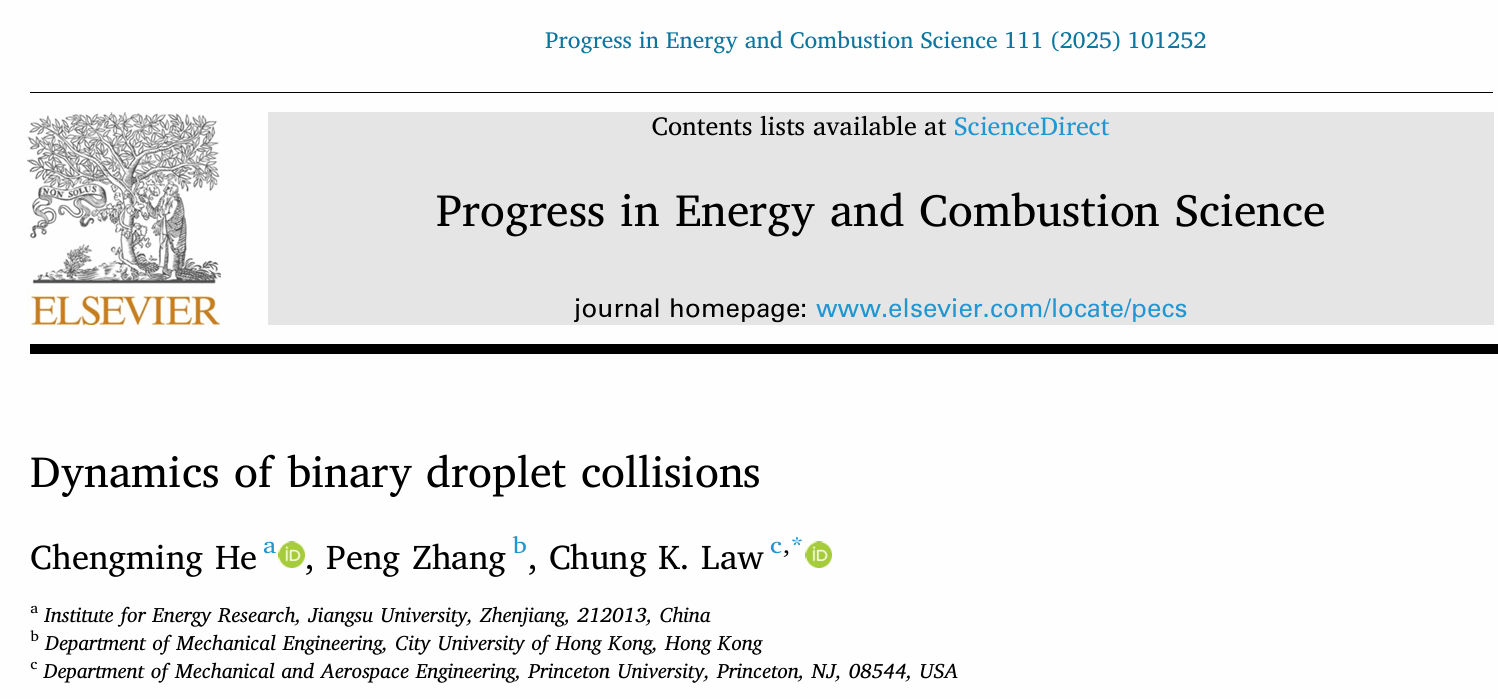 近日,能源研究院金山青年特聘教授何成明聯合香港城市大學副教授張鵬及美國國家工程院院士、普林斯頓大學教授Chung K. Law在能源領域國際頂級期刊Progress in Energy and Combustion Science上發表題為Dynamics of binary droplet collisions(《二元液滴碰撞動力學》)的綜述論文。江蘇大學為第一完成單位,也是學校首次在該能源領域頂刊上發表文章。