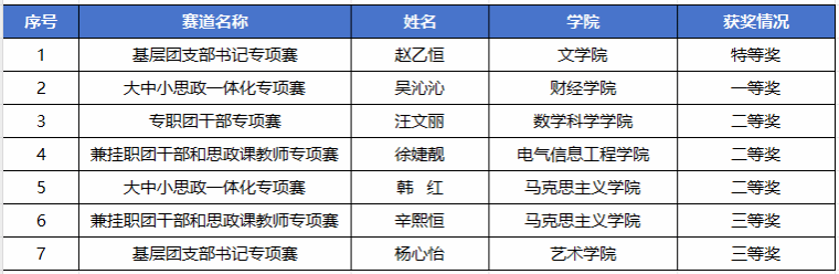 本屆比賽由共青團江蘇省委、中共江蘇省委教育工委、江蘇省社會科學院和江蘇省學生聯合會聯合主辦,分為省級初賽線上評審和省級決賽線下展示兩個環節。其中,省級決賽共吸引全省200余名專職團干部、兼掛職團干部和思政課教師、基層團支部書記同場競技、同題共答。我校遴選推薦10人參賽,7人獲獎。