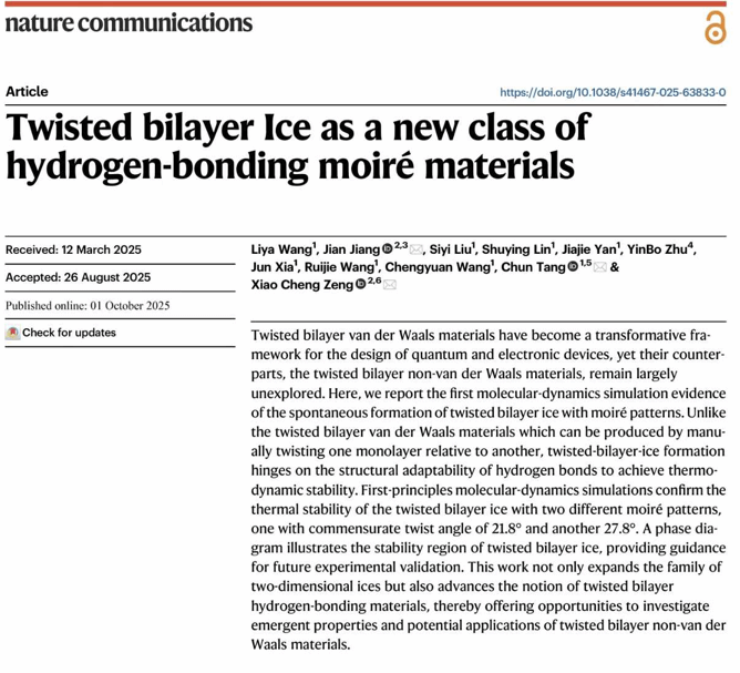 近日,土木工程與力學學院微納米力學團隊唐淳教授、王麗雅副教授與香港城市大學曾曉成教授團隊合作,發現氫鍵主導的非范德華摩爾材料:魔角雙層冰,在國際著名期刊Nature Communications上發表題為Twisted bilayer ice as a new class of hydrogen-bonding moiré materials的論文。江蘇大學為第一完成單位,王麗雅為論文第一作者,香港城市大學江健博士、江蘇大學唐淳和香港城市大學曾曉成為共同通訊作者。