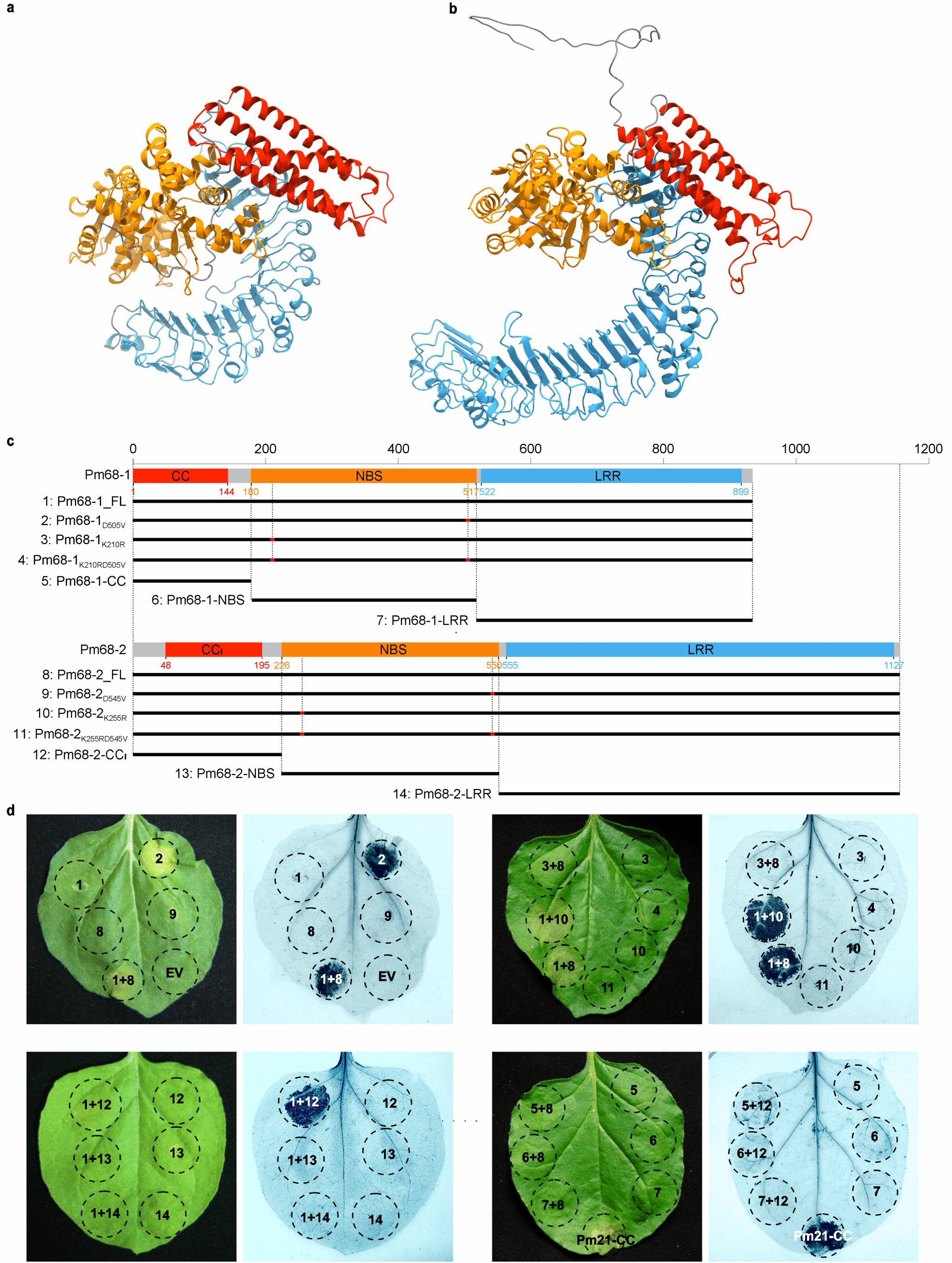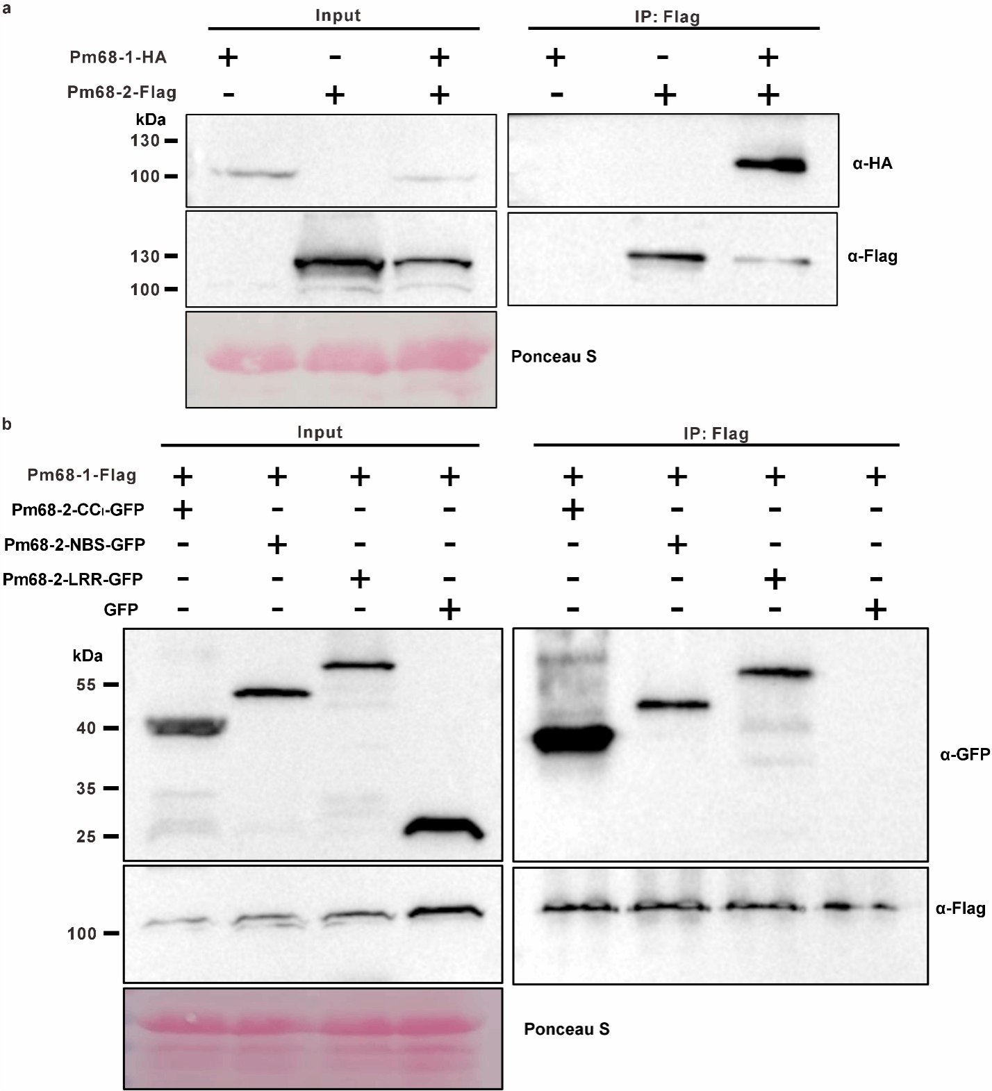 為了確定Pm68-1和Pm68-2之間的功能關系,研究者構建了一系列表達載體,在本氏煙草葉片中進行瞬時過表達實驗。結果表明,單獨表達Pm68-1和Pm68-2均不能夠引起煙草細胞死亡,而共表達Pm68-1和Pm68-2能夠誘發(fā)細胞死亡。對兩個NLR的MHD位點和P-loop位點進行突變分析,結果顯示只有Pm68-1與執(zhí)行細胞死亡有關。進一步分析不同結構域,發(fā)現(xiàn)只有全長Pm68-1和Pm68-2的CC1結構域共表達才能誘發(fā)煙草細胞死亡。由此推測,Pm68-1是誘導細胞死亡的關鍵參與者,其活性受到Pm68-2的CC1結構域的調控。Co-IP實驗證實Pm68-1與Pm68-2及其三個結構域都能發(fā)生互作。