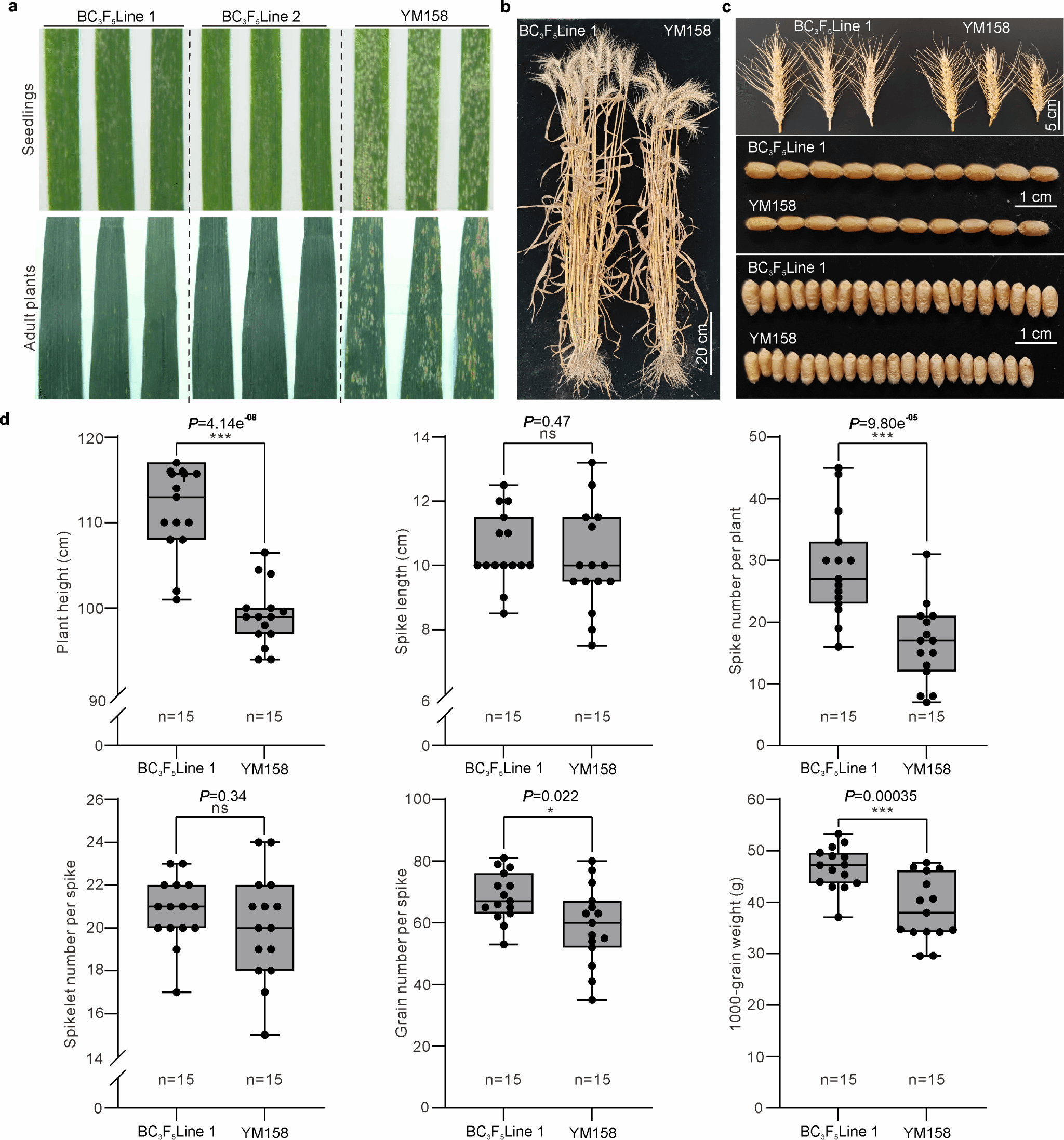 研究者將攜帶Pm68基因的硬粒小麥TRI 1796與感白粉病的小麥骨干親本揚麥158雜交,并以揚麥158作為輪回親本多次回交、自交后,創(chuàng)制了含有Pm68的普通小麥漸滲系,它在苗期和成株期均能表現(xiàn)出良好的白粉病抗性,而且該新種質的單株穗數、穗粒數和千粒重等重要農藝參數均顯著高于輪回親本揚麥158,具有較好的育種利用價值。