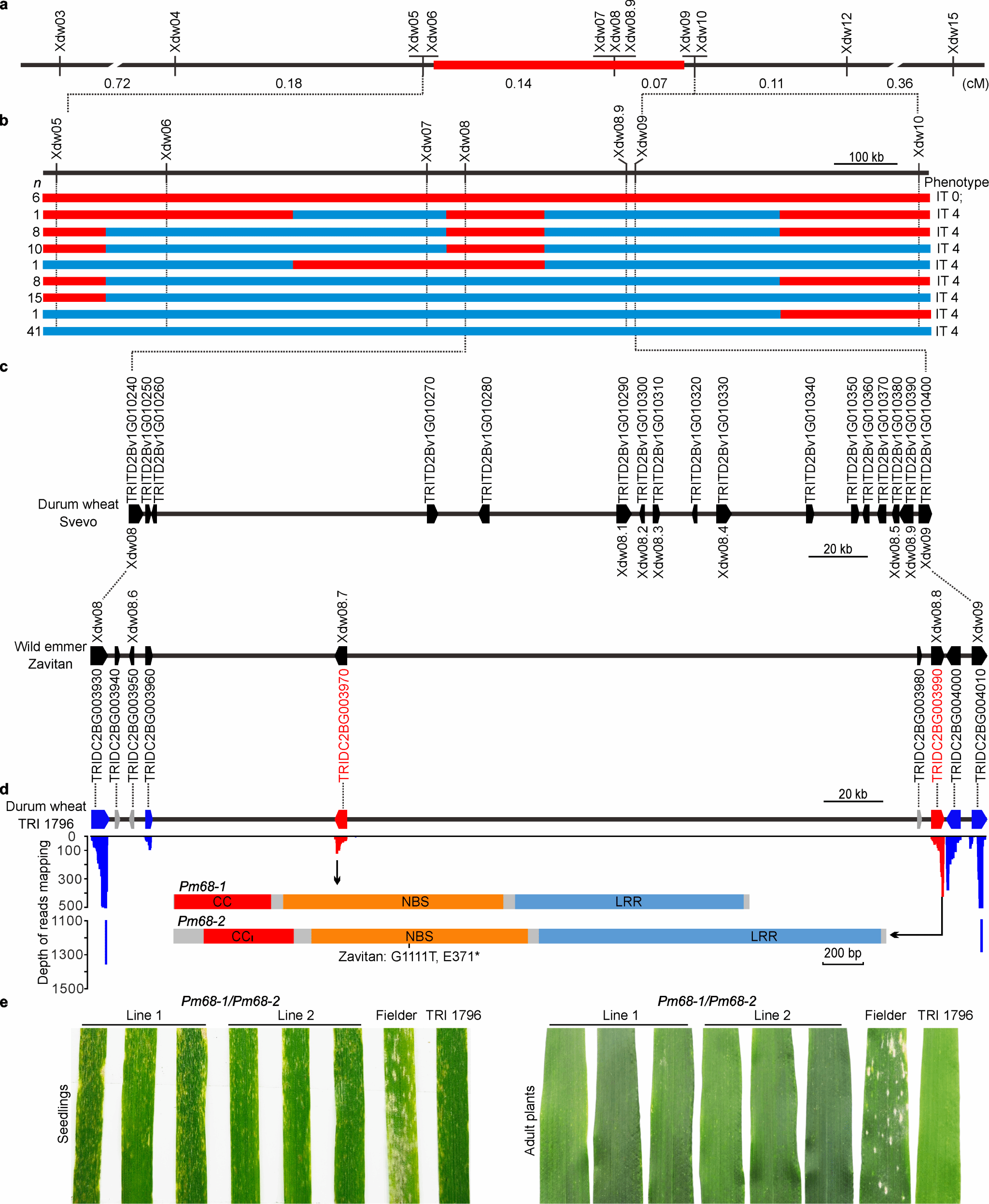 小麥白粉病是由布氏白粉菌引起的流行性真菌病害,在我國各大麥區(qū)廣泛發(fā)生,常年發(fā)病面積為一億畝左右,嚴重威脅我國小麥糧食安全,挖掘和利用抗白粉病基因是控制白粉病危害的重要措施。2021年,何華綱團隊首次報道了來源于硬粒小麥品種TRI 1796的2BS染色體上的抗白粉病新基因Pm68(經國際小麥命名委員會正式定名),在小麥抗病育種中具有潛在利用價值。