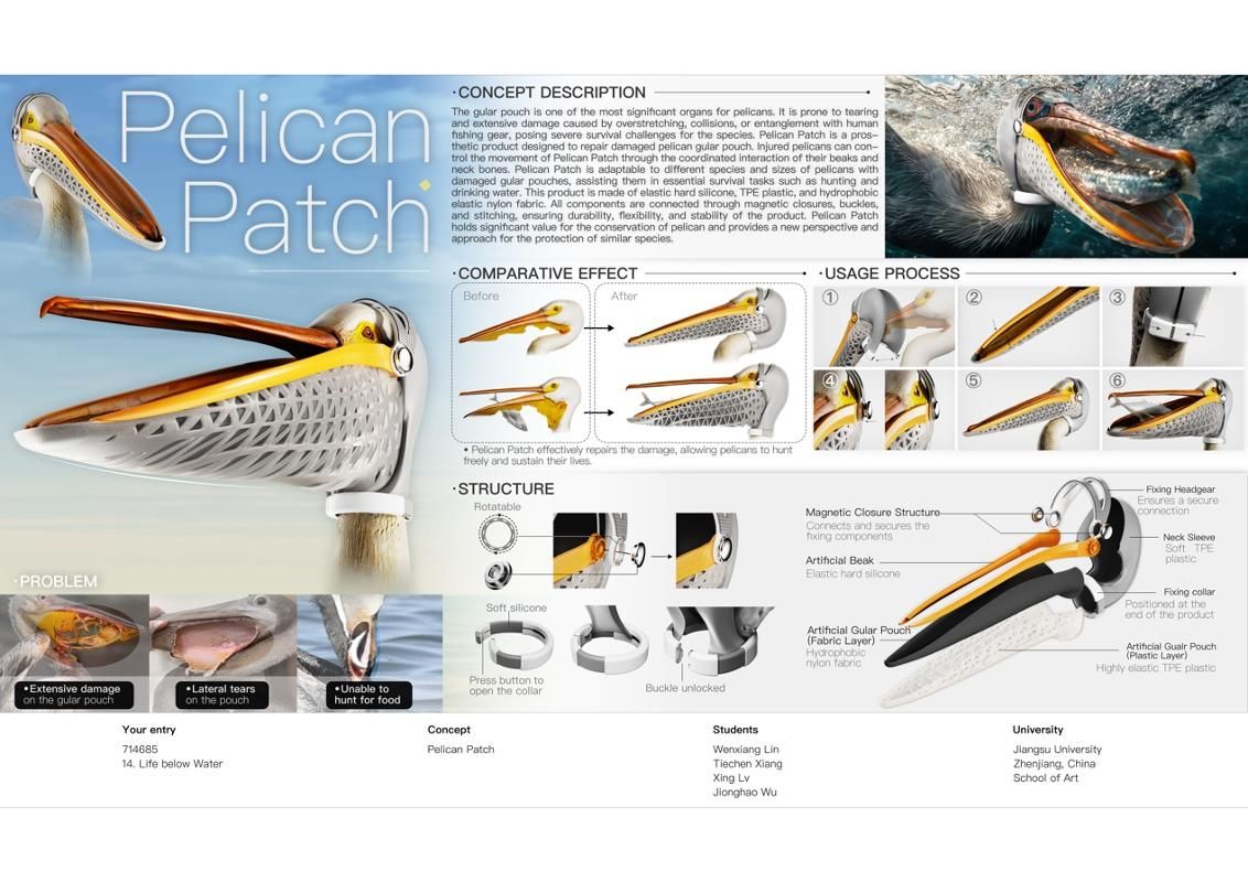 獲獎(jiǎng)作品Pelican Patch聚焦野生動(dòng)物保護(hù)議題,針對(duì)喉囊受損的鵜鶘,設(shè)計(jì)了一款創(chuàng)新型人工喉囊義體。該作品在結(jié)構(gòu)設(shè)計(jì)、生物行為適配以及新材料應(yīng)用等方面展現(xiàn)出高度的系統(tǒng)性與創(chuàng)造性,既體現(xiàn)了設(shè)計(jì)團(tuán)隊(duì)對(duì)生物形態(tài)與功能的深入理解,也反映了新材料在生命關(guān)懷場(chǎng)景下的高效整合能力。