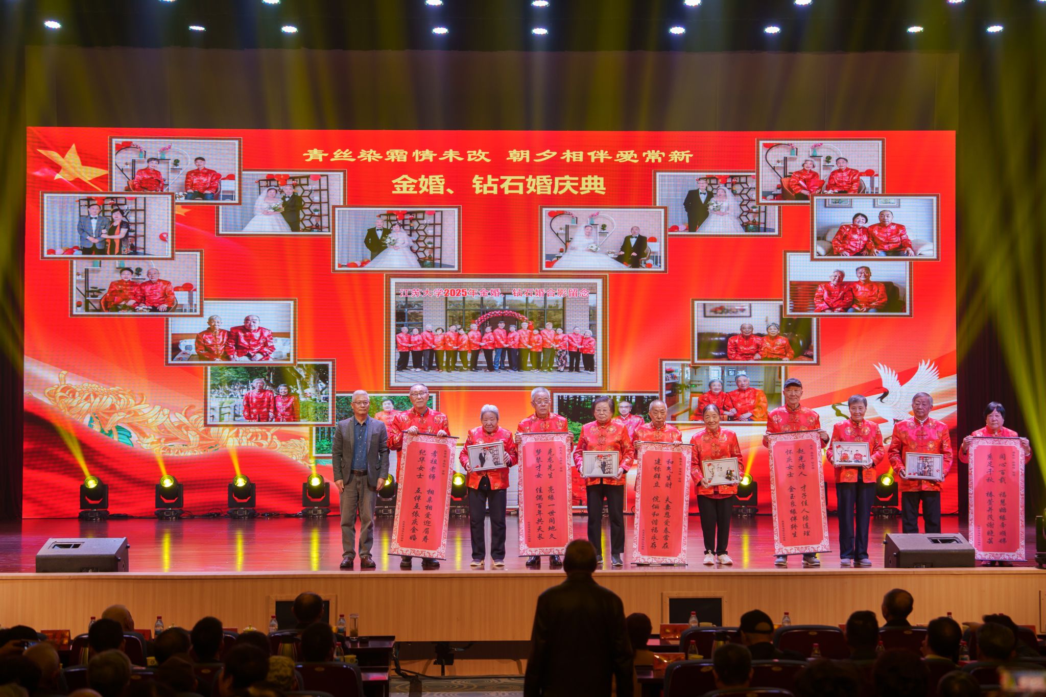金婚、鉆石婚慶典環(huán)節(jié),陸洪標(biāo)、張濟(jì)建分別為金婚、鉆石婚代表頒發(fā)禮品。現(xiàn)場掌聲陣陣,溫馨氛圍感染全場。今年,學(xué)校共有金婚夫婦11對、鉆石婚夫婦8對。離退休工作部提前為他們拍攝紀(jì)念照,綠野詩社為每對夫婦撰寫了祝福楹聯(lián)。