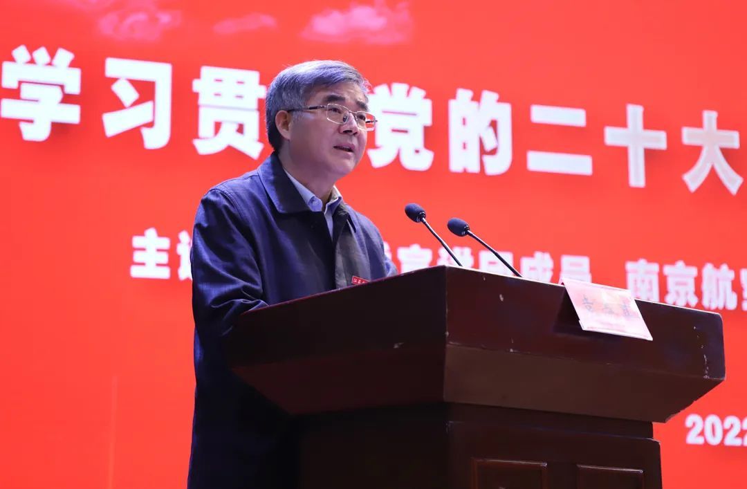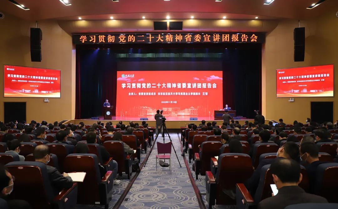 11月16日,學習貫徹黨的二十大精神省委宣講團報告會在學校小禮堂舉行,省委宣講團成員、南京航空航天大學馬克思主義學院院長王智教授應邀作宣講報告。校院兩級黨委理論學習中心組全體成員、各民主黨派基層組織負責人、機關黨委全體黨員以及師生代表等參加報告會。報告會由校黨委書記袁壽其主持。