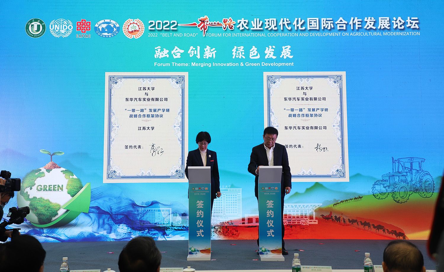 項目儀式上,農業裝備國際(產能)合作聯盟—中東歐國家農業現代化產學研示范中心成立、農業裝備國際(產能)合作聯盟智庫揭牌、江蘇大學與東華汽車實業有限公司成立“一帶一路”發展基金簽約、國際人才“感知中國”教育基地和國際人才創新實踐基地授牌。