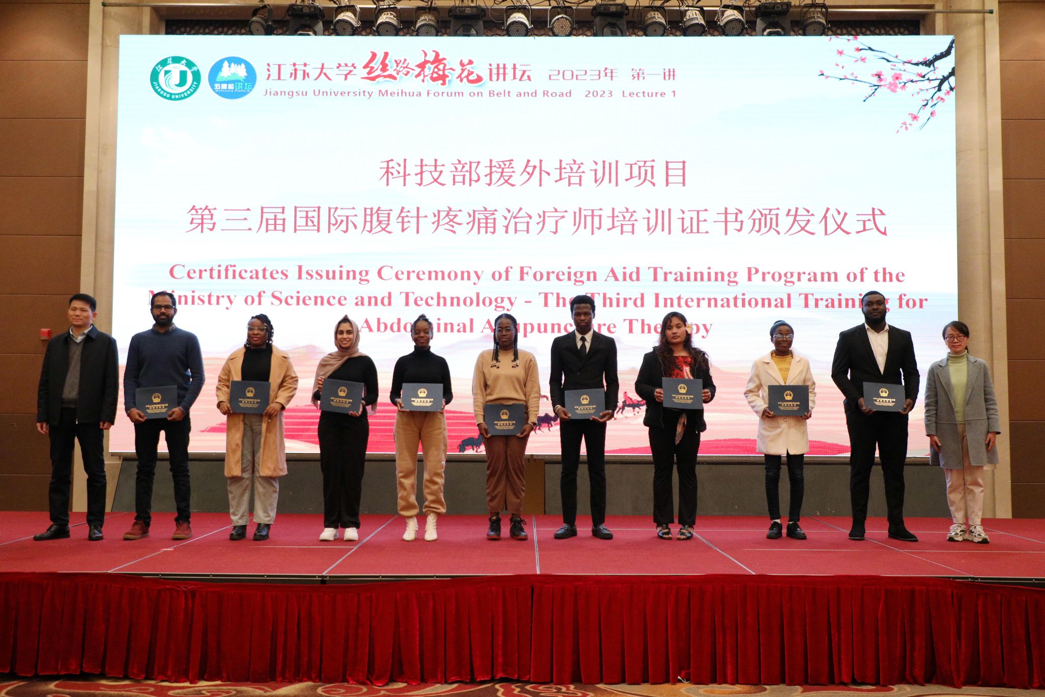 現場還舉行了鎮江航空教育小鎮授牌“感知中國基地”儀式、教育部中外人文交流中心高層次國際化人才培養創新實踐項目全球治理課程證書頒發儀式、科技部援外培訓項目第三屆國際腹針疼痛治療師培訓證書頒發儀式。