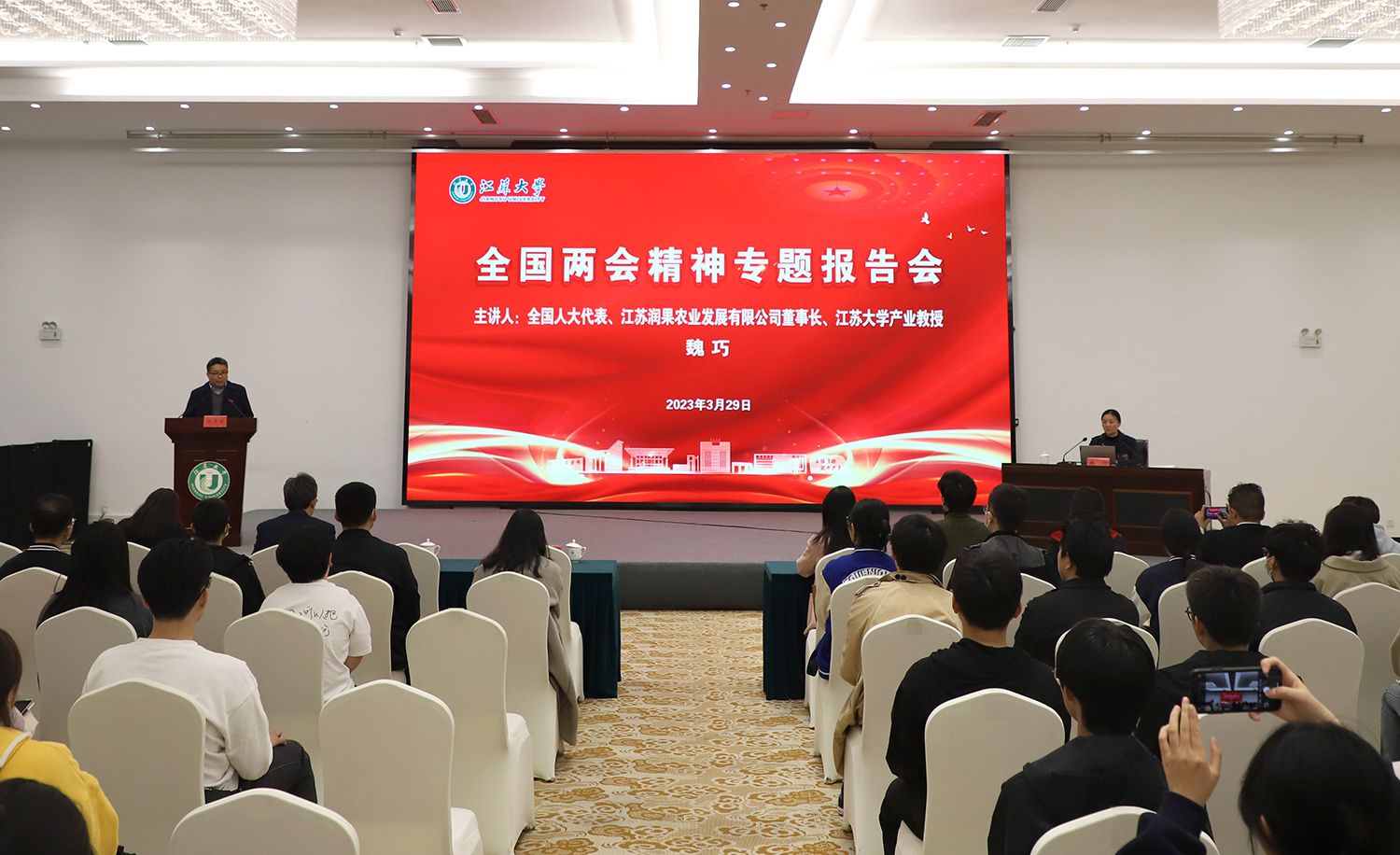 3月29日,江蘇大學全國兩會精神專題報告會在青教公寓多功能廳舉行。全國人大代表、鎮江市鎮江新區永興農機機械化專業合作社理事長、江蘇潤果農業發展有限公司董事長、江蘇大學產業教授魏巧走進校園,為師生作全國兩會精神專題報告。報告會由校黨委常委、宣傳部部長楊道建主持。