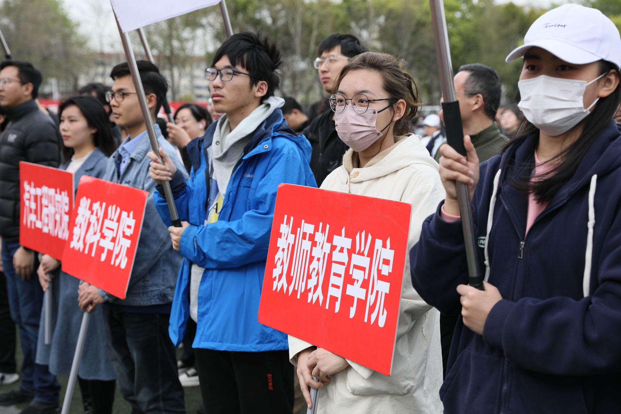 學院及機關人員組成的40個方陣、1200多名師生,高舉旗幟,精神抖擻,在沿途大學生志愿者的引導下,完成校園環線健步走。