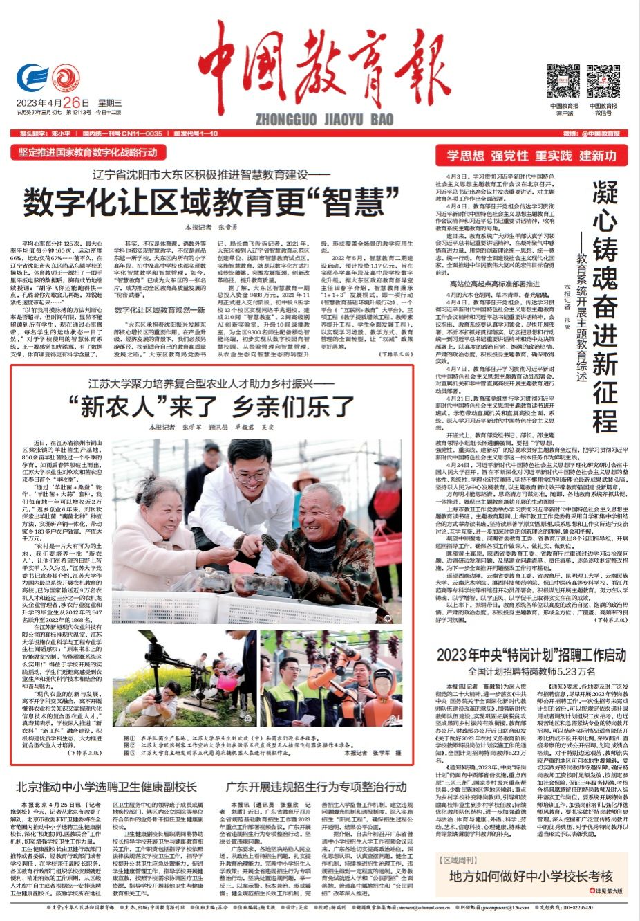 4月26日,《中國教育報》一版刊登文章《江蘇大學聚力培養復合型農業人才助力鄉村振興——“新農人”來了 鄉親們樂了》,報道我校培養強農興農人才,賦能農業現代化的生動實踐故事。