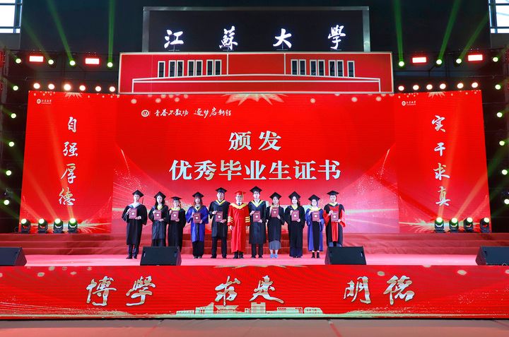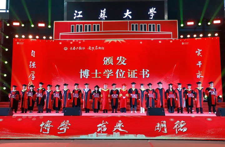 上午10時,2025屆博士生、碩士生、本科生代表依次登上主席臺。學校領導及黨委常委為他們一一頒發學位證書、扶正流蘇。江蘇大學黨委書記李洪波為優秀畢業生代表頒發榮譽證書。