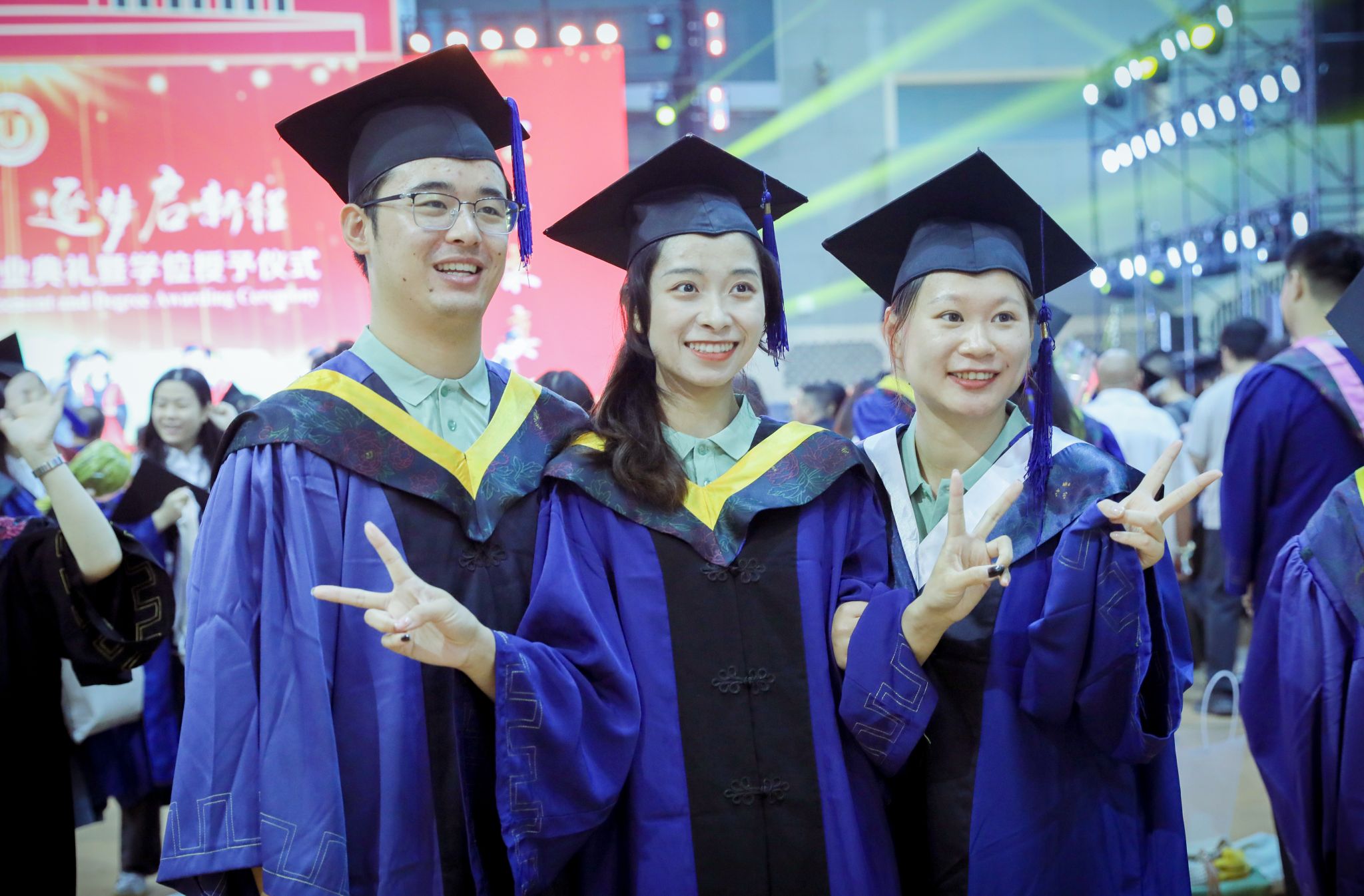 典禮現場,師生代表帶來情景朗誦《一路生花》、歌舞《祝我們前程似錦》等精彩節目,深情回望江大時光與青春歲月。典禮尾聲,全場起立,齊聲合唱校歌《百年輝煌向未來》,兩只象征美好的“金鳳凰”于場館上空盤旋,將氣氛推向高潮。