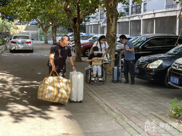 在江蘇大學綜合樓前,記者見到了仲思懿一家。學校安排的志愿者幫她提著行李箱,帶領她前往宿舍。