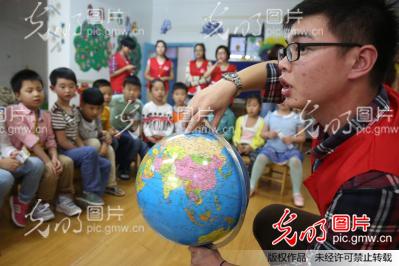 2014年6月26日,大學生(右)通過照片向孩子們介紹生態環境正面臨的危機。 當日,江蘇省鎮江市沃得國際雙語幼兒園開展“大手牽小手 環保齊步走”主題活動,來自江蘇大學的大學生環保志愿者牽手小朋友,一起學習環保知識,并動手利用廢舊物制做環保手工,培養孩子們從小養成節約資源、低碳環保的生活習慣。 (中國質量報 2014/6/26 楊 雨)
